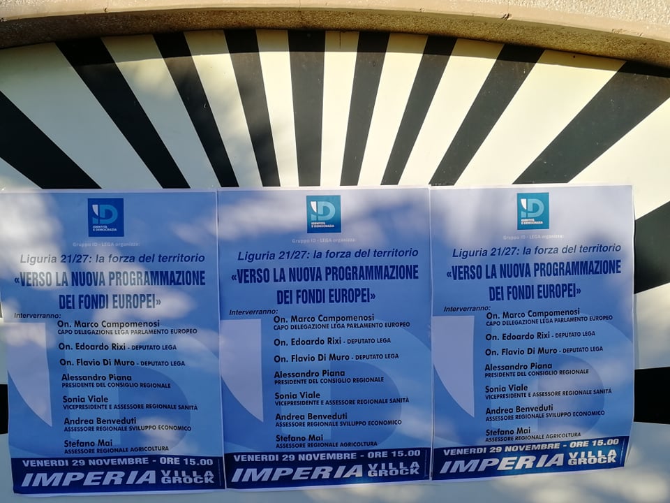 Si è tenuto questo pomeriggio, a Villa Grock, a Imperia, il convegno “Verso la nuova programmazione dei fondi europei. Liguria 20-27: infrastrutture, ambiente, sviluppo economico e sanità” organizzato dal gruppo ID-Lega al Parlamento Europeo.