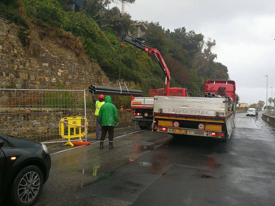 Presso la frana di Capo Berta è iniziato il posizionamento dei micropali di fondazione che serviranno da sostegno al muro che sorregge la strada.