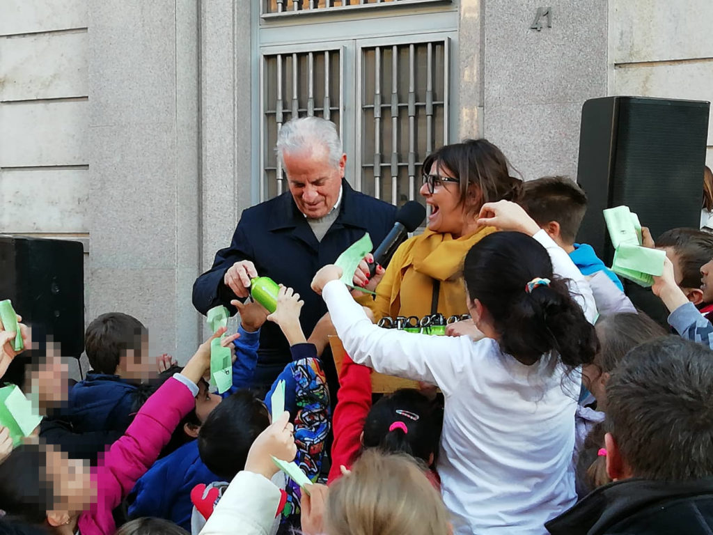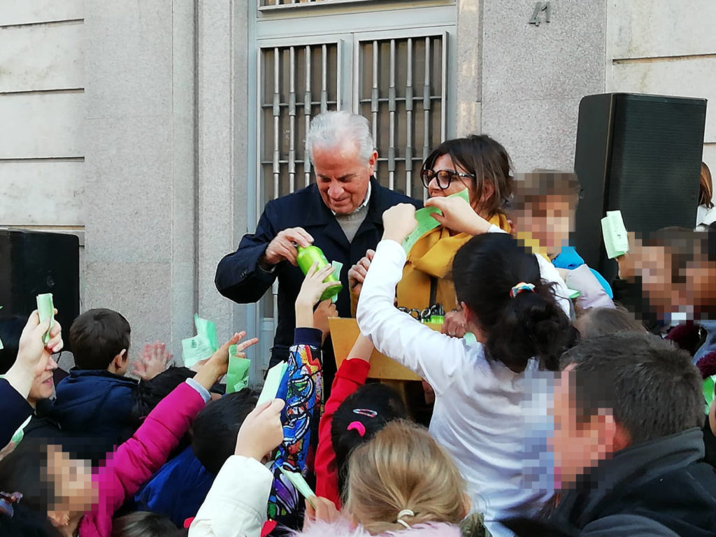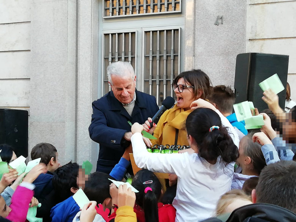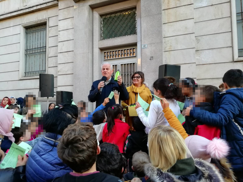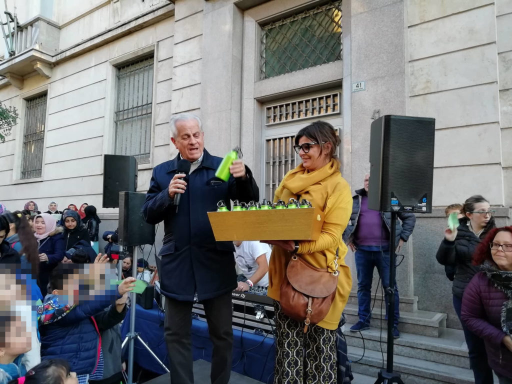 In via Cascione la consegna delle borracce ai bambini delle scuole