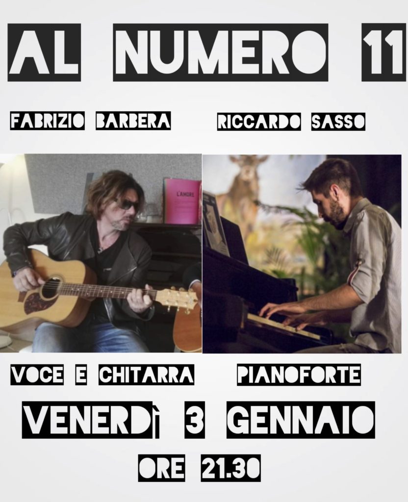 Saranno Fabrizio Barbera (voce e chitarra) e Riccardo Sasso (pianoforte) ad esibirsi venerdì 3 gennaio al N. 11 di Piazza de Amicis a Imperia (ore 21.30) con brani in versione acustica di Elton John,Eagles,Eric Clapton, Lenny Kravitz,Beatles,David Bowie, Zucchero,Santana.