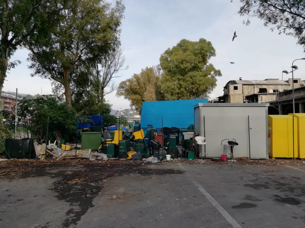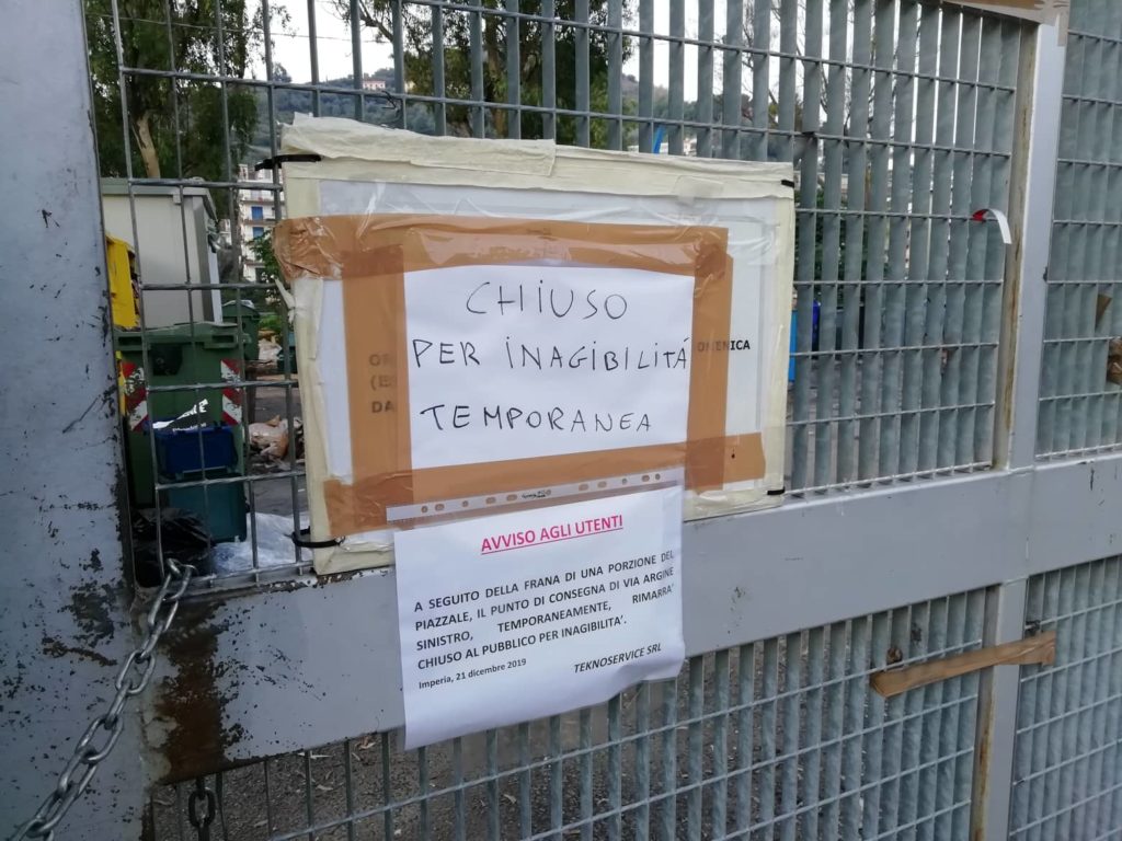 Le forti piogge delle scorse settimane e il conseguente ingrossamento del torrente Impero hanno eroso una parte del piazzale del punto di raccolta rifiuti sull’argine sinistro, rendendo il luogo inagibile. Per sicurezza, quindi, l’area è stata chiusa al pubblico, ma all’interno sono rimasti i container ricolmi di rifiuti.
