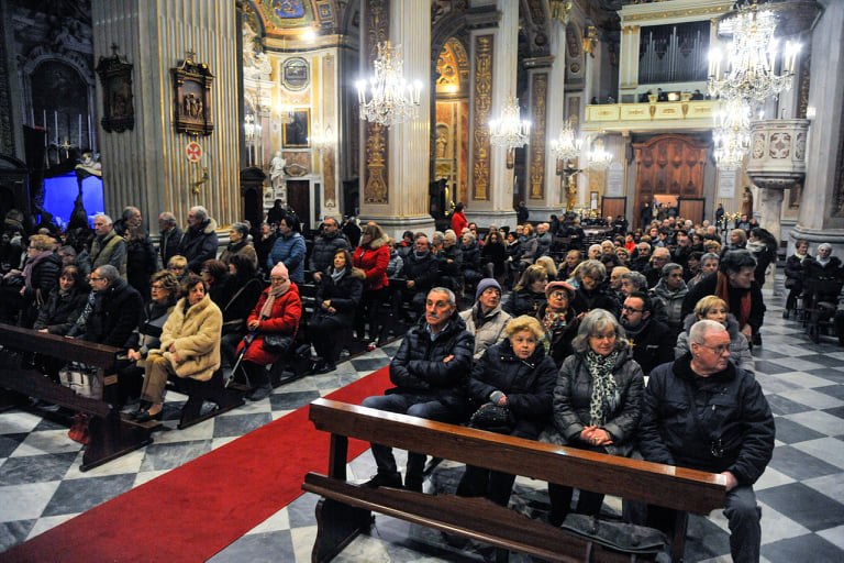 Folla di fedeli oggi, presso la basilica di San Giovanni, a Imperia, per assistere all’arrivo della reliquia di Padre Pio, uno dei celebri guanti di lana che utilizzava il religioso per coprire le stigmate.