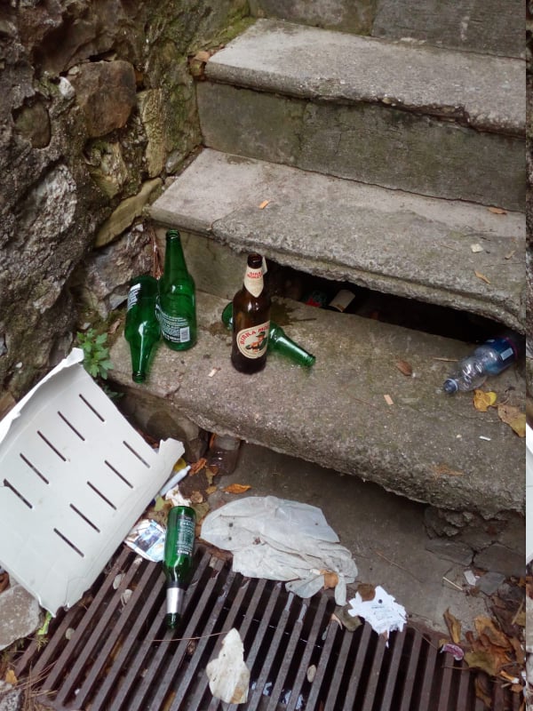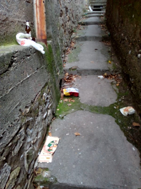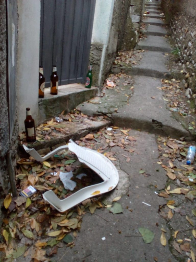 Sporcizia, vetri rotti, sigarette, bottiglie di birra, pacchetti di patatine e merendine. Nel vicoletto c’è anche una sedia rotta.