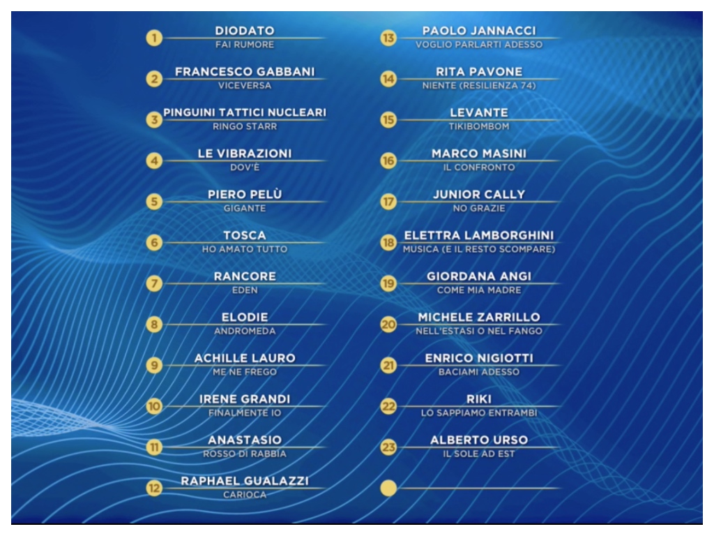 La gara è continuata con Rita Pavone con “Niente (Resilienza 74), Enrico Nigiotti con “Baciami ancora”, Elettra Lamborghini con “Musica (e il resto scompare) e infine Marco Masini con “Il Confronto”.