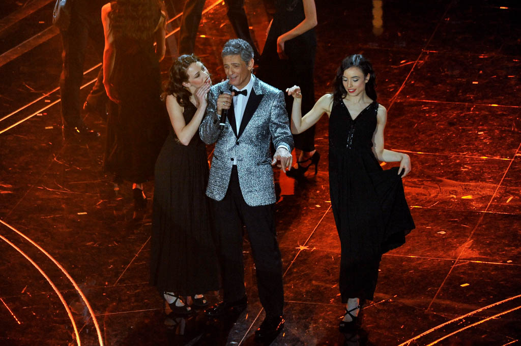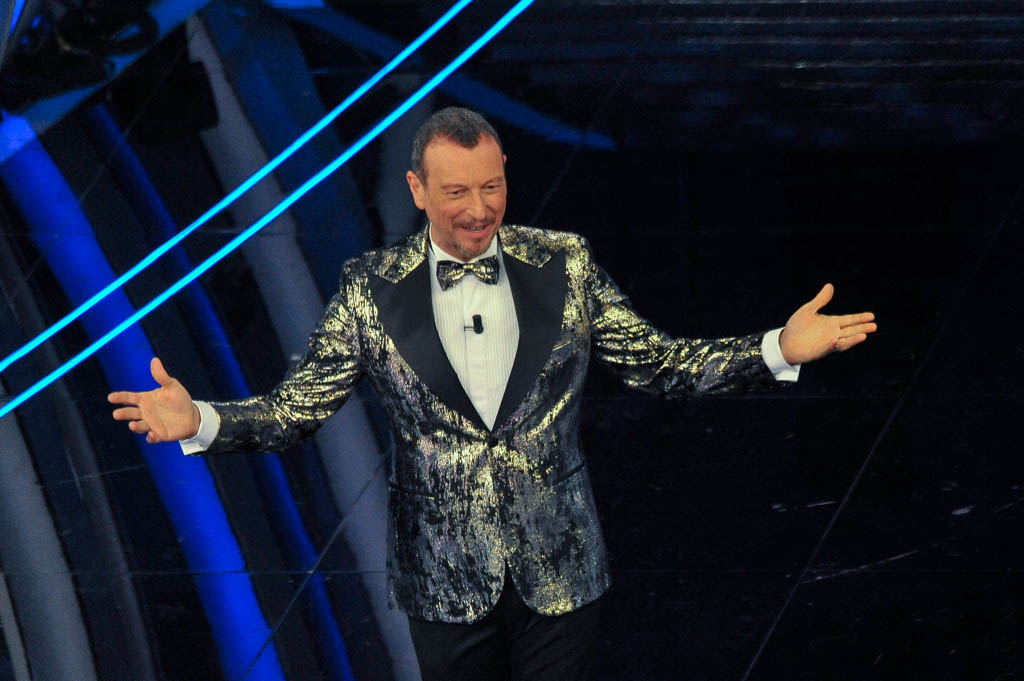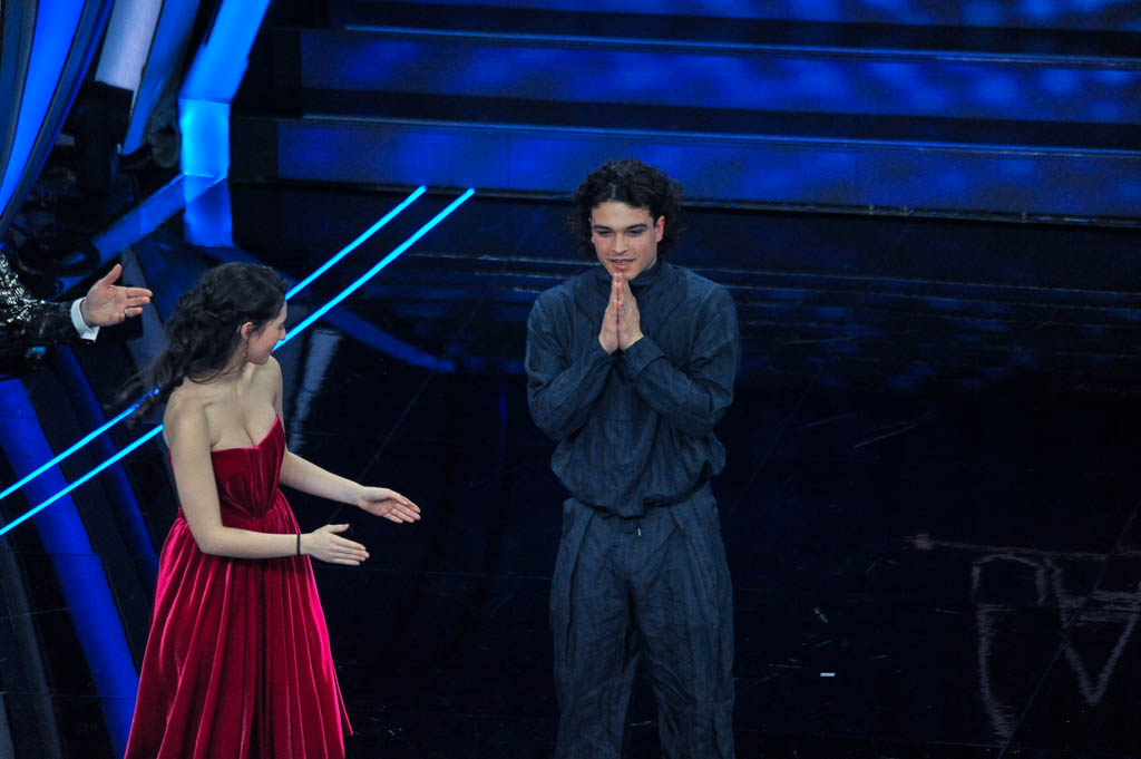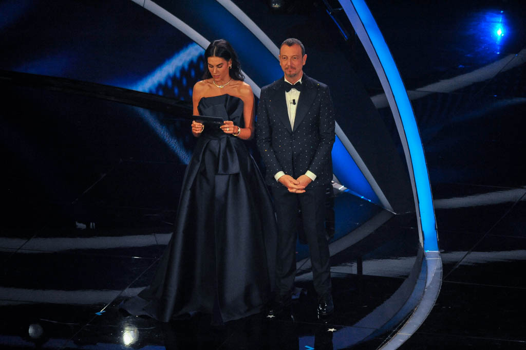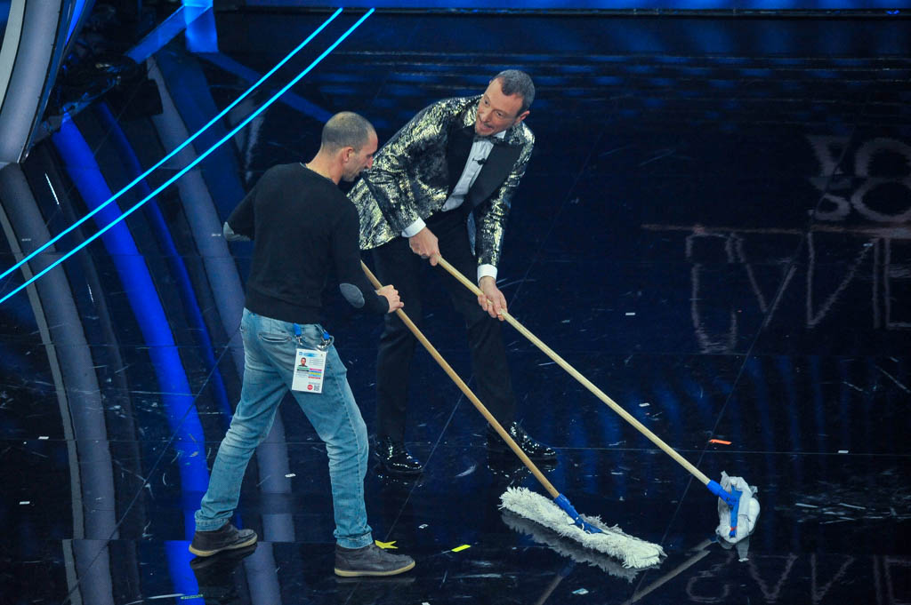 Ricordando la gaffe del famoso “passo indietro”, Amadeus ha provato a rimediare disegnando una riga per terra, per far stare davanti Francesca Sofia Novello.