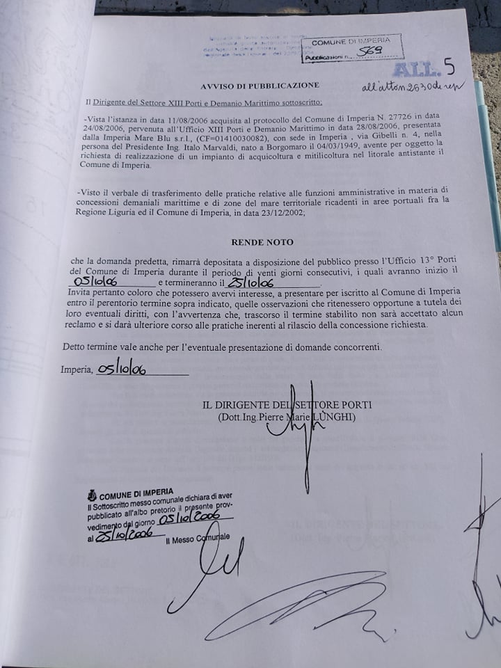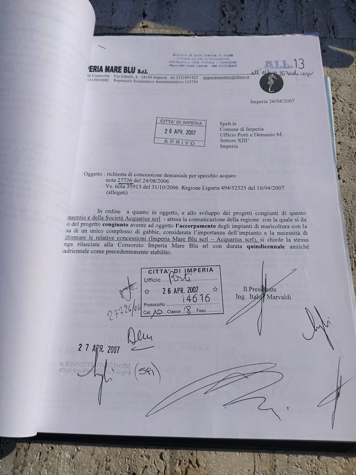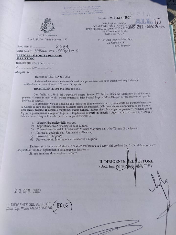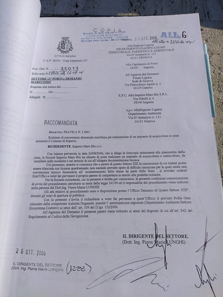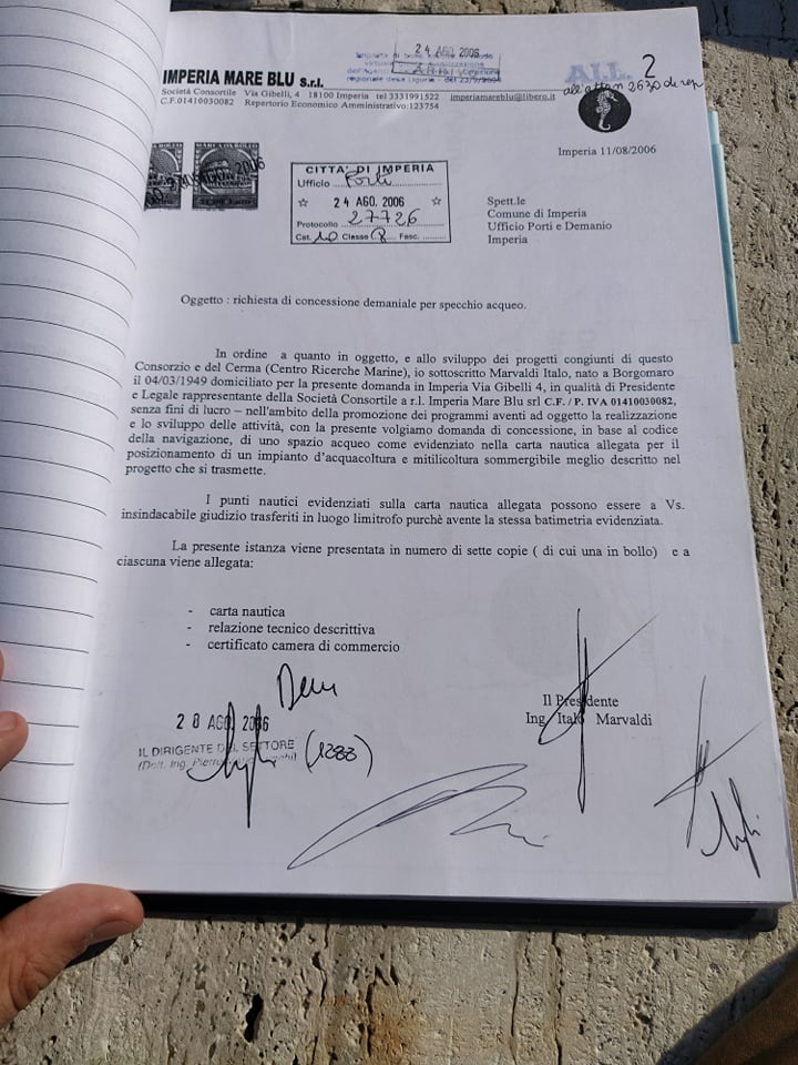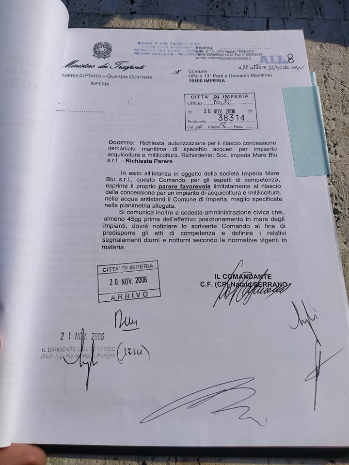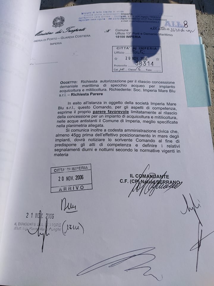 Nella galleria fotografica la documentazione risalente al 2006, con i permessi per l’impianto di acquacoltura alla società Imperia Mare Blu Srl e la concessione.