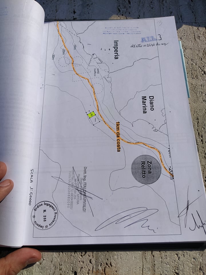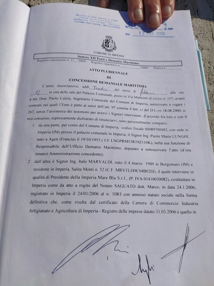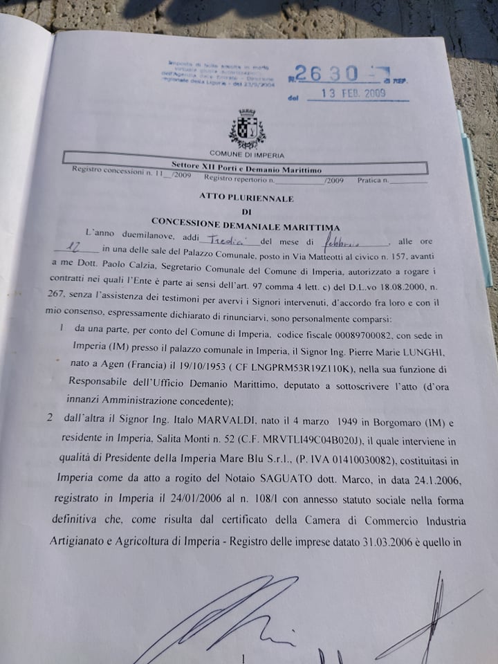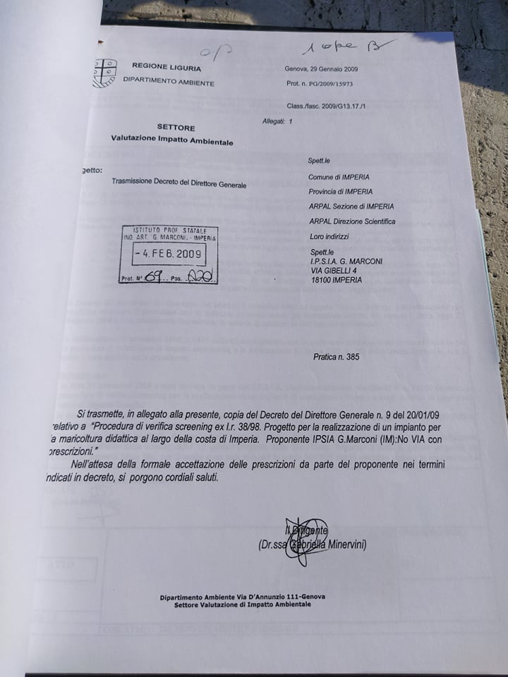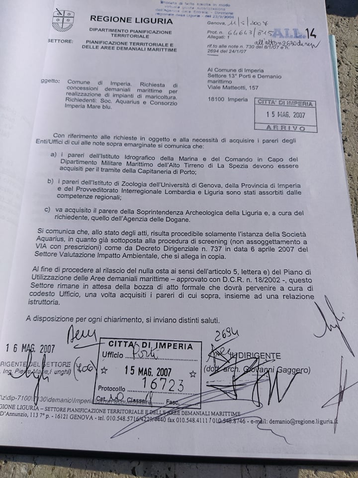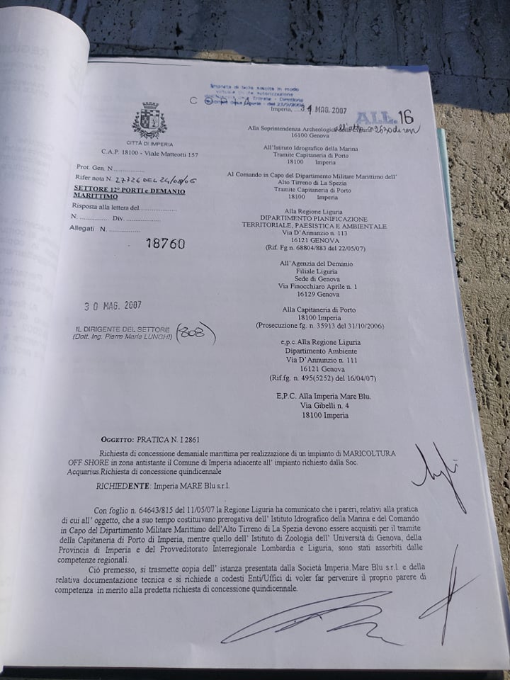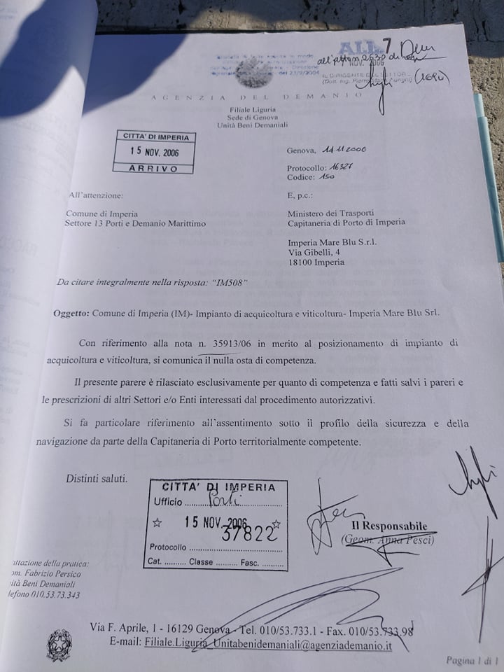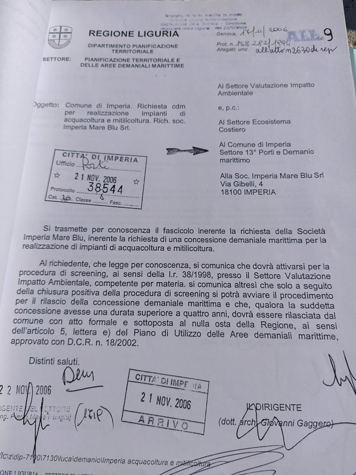 Nella galleria fotografica la documentazione risalente al 2006, con i permessi per l’impianto di acquacoltura alla società Imperia Mare Blu Srl e la concessione.