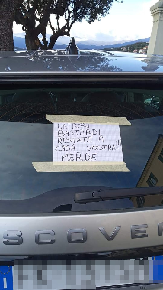 “Untori bastardi restate a casa vostra merde”. Questo il cartello affisso sul lunotto posteriore di un’auto parcheggiata a Imperia.