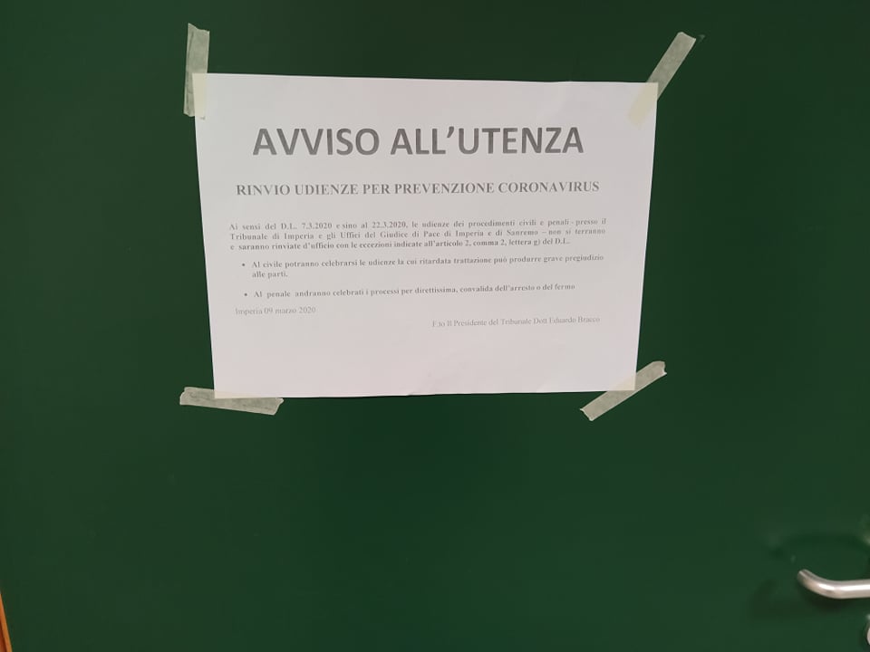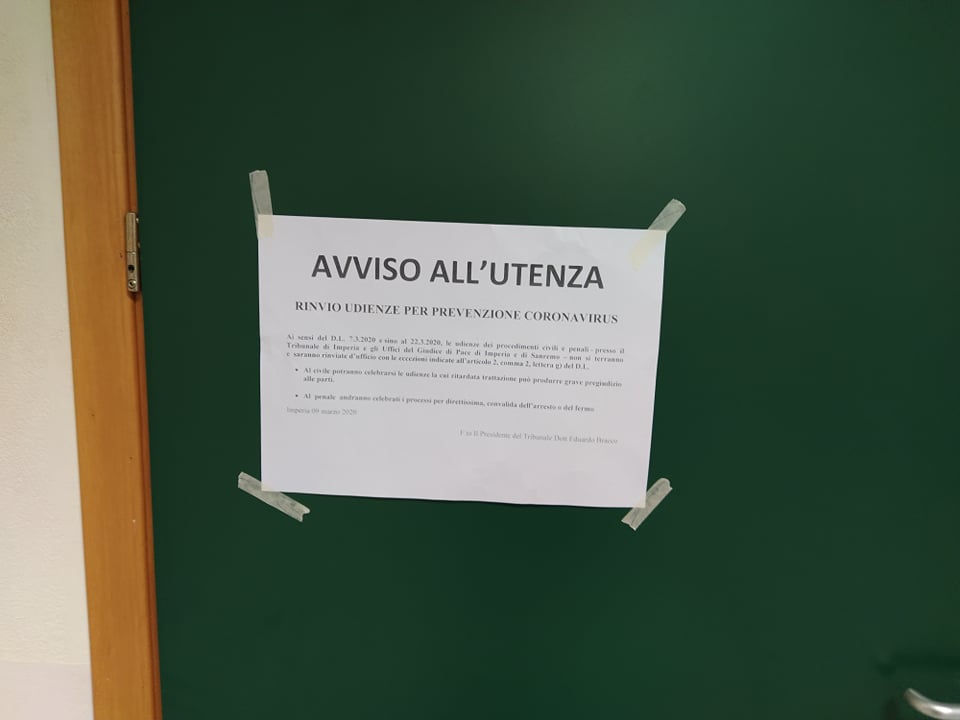 “Sino al 22 marzo 2020 le udienze dei procedimenti civili e penali presso il Tribunale di Imperia e gli Uffici del Giudice di Pace di Imperia e di Sanremo non si terranno e saranno rinviate d’ufficio con le eccezioni indicate dall’art. 2 comma 2 lettera g) del D.I.
