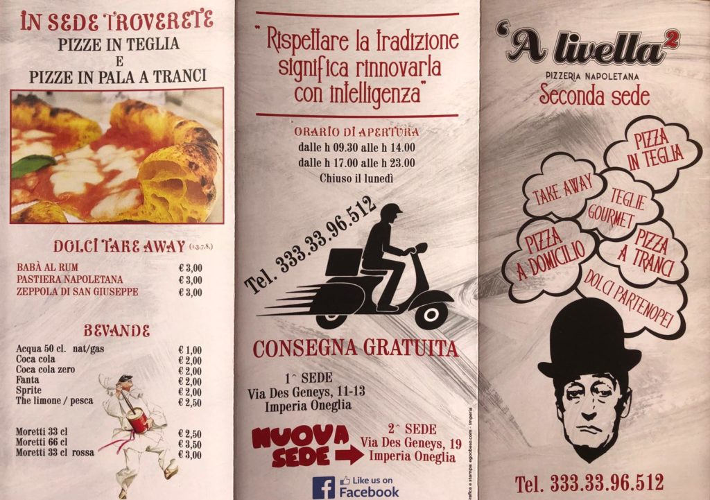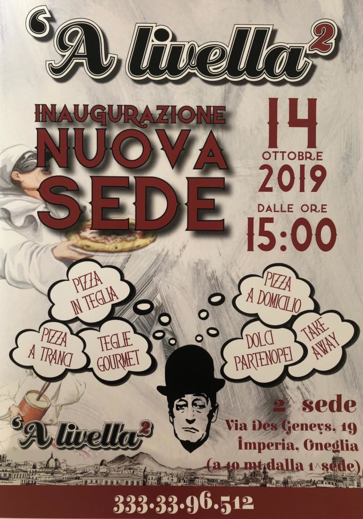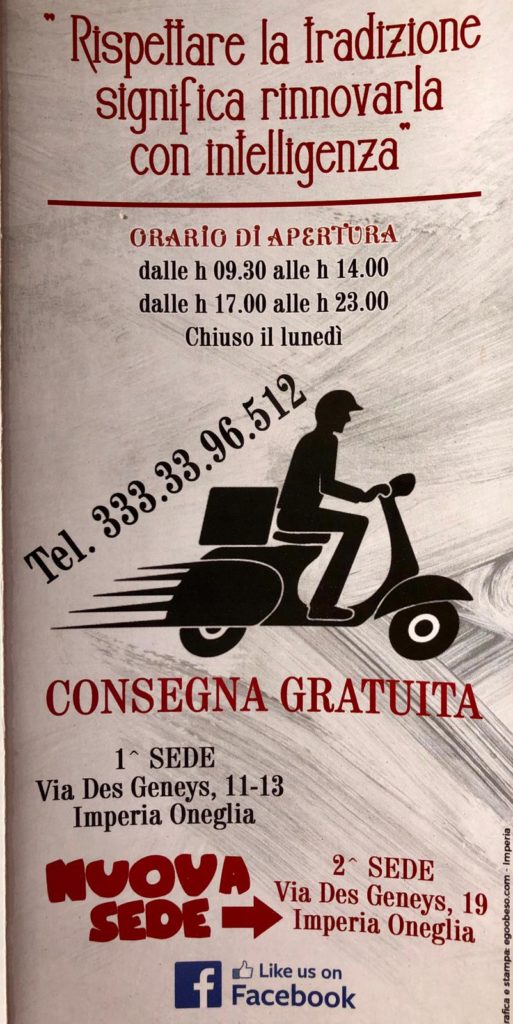 Imperia. A Livella Seconda sede, in via Des Geneys 19 ( tel: tel: 3333396512 ) nel rispetto del Decreto del Consiglio dei Ministri osservando le norme igienico-sanitarie, continua l’ attività effettuando consegne a domicilio a cena (prenotazioni dalle 17.30).
