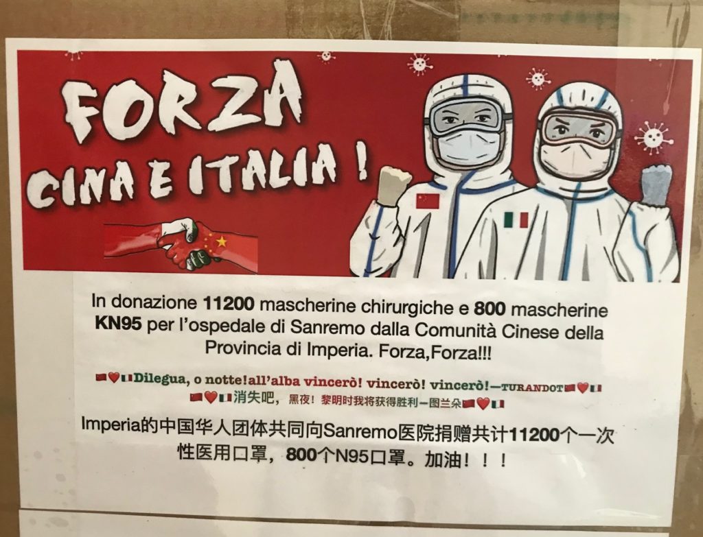 “Ringraziamo di cuore la comunità cinese per questo contributo e il Sindaco di Bordighera, Vittorio Ingenito, per averci messo in contatto con loro. – afferma il Direttore Generale di ASL1, Marco Damonte Prioli – Sono giorni di grande impegno e sacrificio per tutti. L’affetto e il sostegno che stiamo ricevendo da parte di cittadini, associazioni e imprenditori, ci aiuta ad affrontare questa emergenza che, come ci hanno ricordato anche i nostri amici cinesi, potrà essere superata solo con il comportamento corretto e responsabile di ognuno”.
