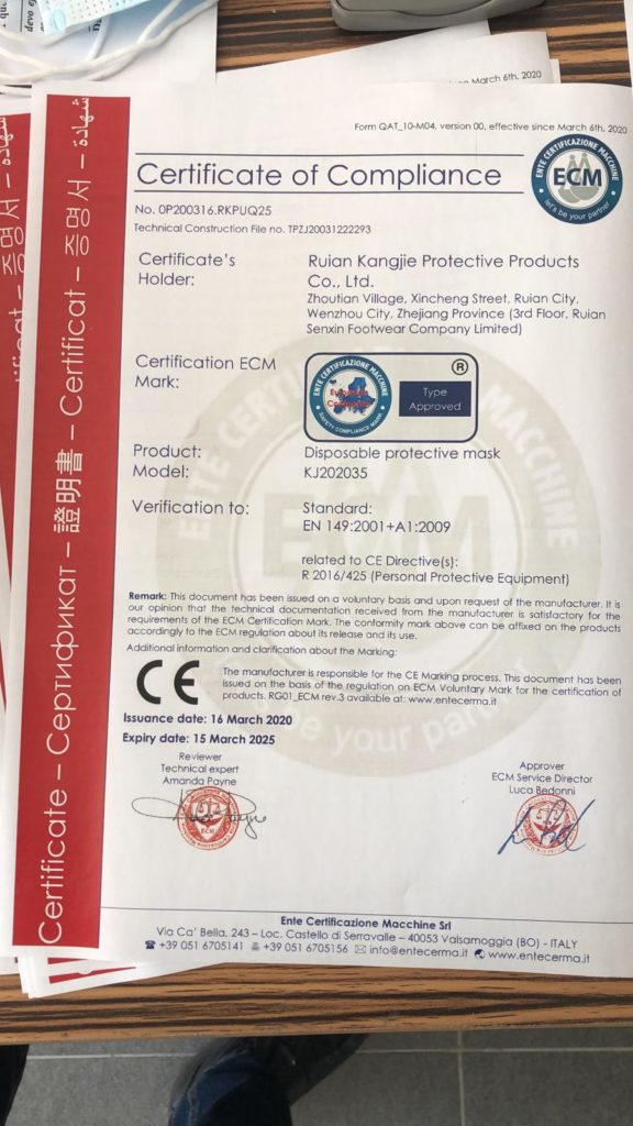Sono stati trovati certificati predisposti in inglese da due ditte italiane, da una polacca e da una cinese, certificati peraltro inutilizzabili perché non consentiti per i prodotti medicali. Infatti quelli italiani spiegavano, sempre in inglese, che non potevano sostituire la corretta dichiarazione CE di conformità, in Italia rilasciabile solo da INAIL per i DPI e dall’Istituto Superiore di Sanità per le
