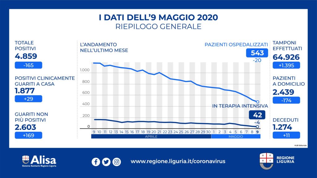 Buona la curva dei guariti e non più positivi (+169) rispetto a ieri e i clinicamente guariti a casa (+29). Non accennano a diminuire i decessi, + 11 il dato è stabile da alcuni giorni. Sono stati 64.926 (+1.395) i tamponi effettuati sulla popolazione ligure.
