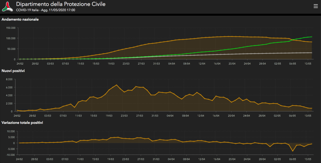 Nell’ambito del monitoraggio sanitario relativo alla diffusione del Coronavirus sul nostro territorio, a oggi, 11 maggio, il totale delle persone che hanno contratto il virus è 219.814, con un incremento rispetto a ieri di 744 nuovi casi. Il numero totale di attualmente positivi è di 82.488, con una decrescita di 836 assistiti rispetto a ieri.