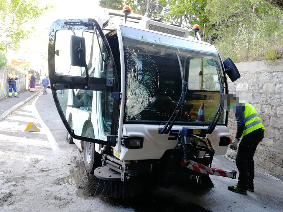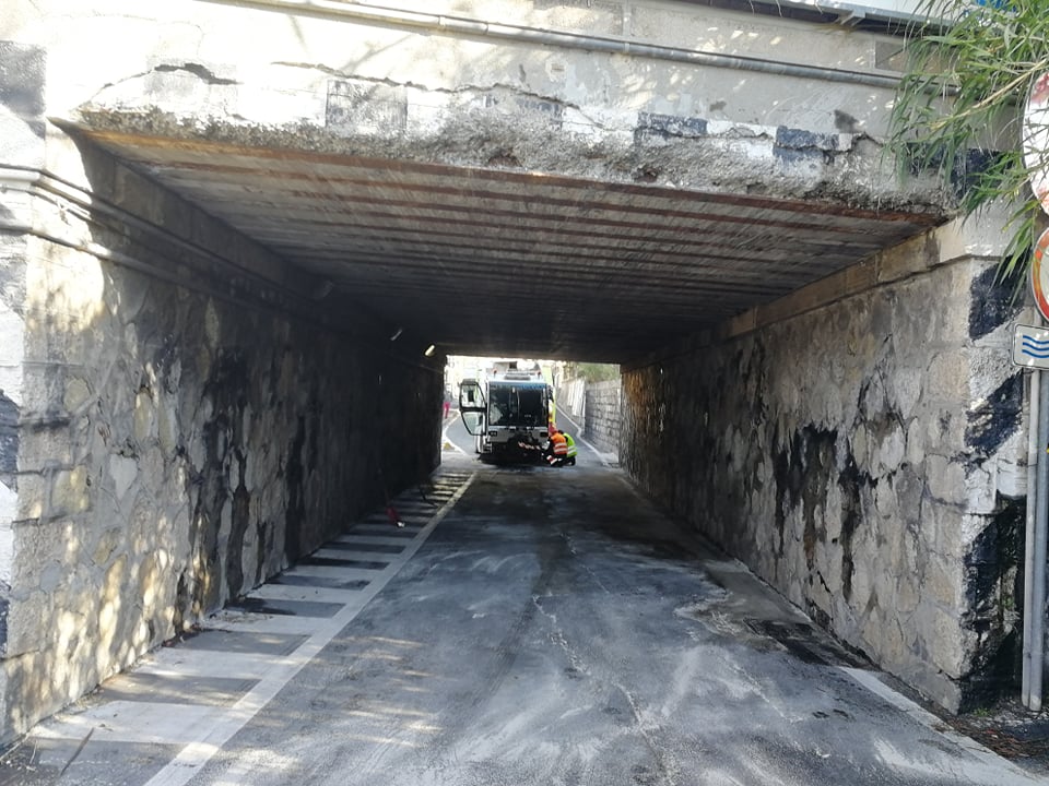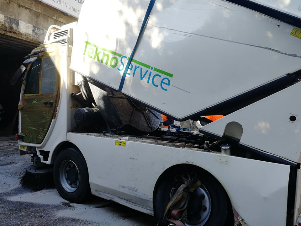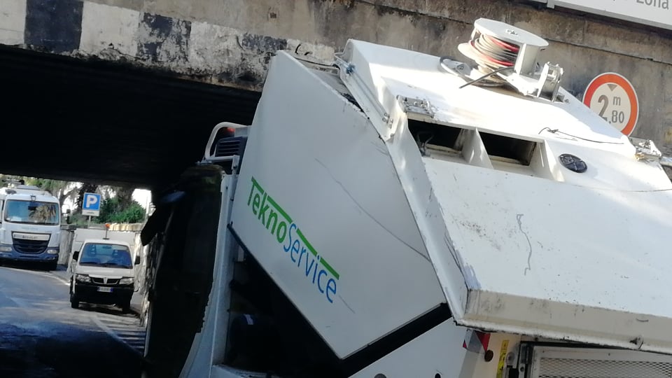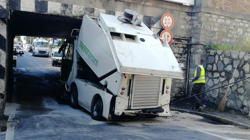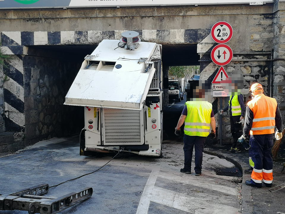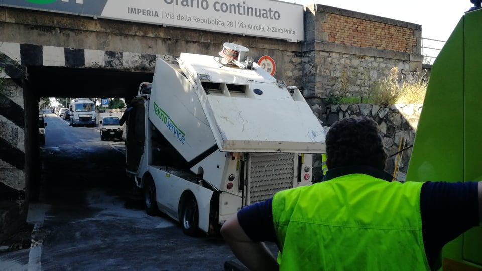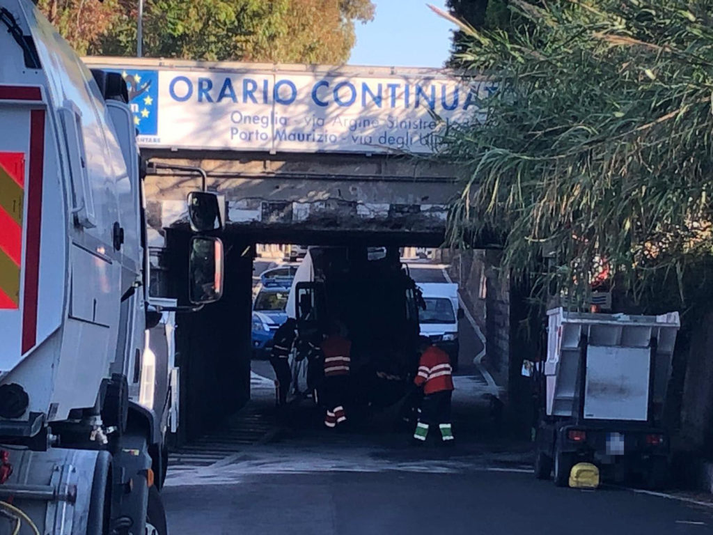 Per motivi ancora in fase di accertamento, la spazzatrice della Teknoservice, ditta incaricata della raccolta rifiuti a Imperia, è rimasta incastrata sotto al ponte della ferrovia sull’Argine Sinistro.
