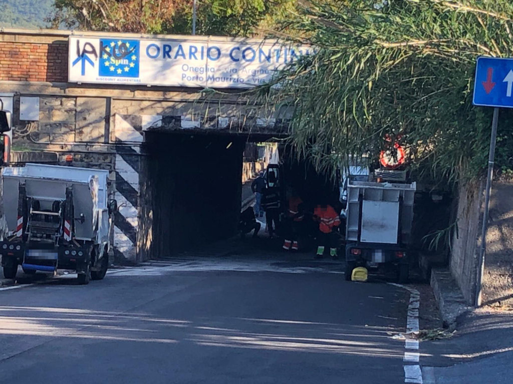 Incidente questa mattina sull’Argine Sinistro a Imperia. Un mezzo della Teknoservice, adibito al lavaggio strade, è rimasto incastrato sotto il ponte della ferrovia.