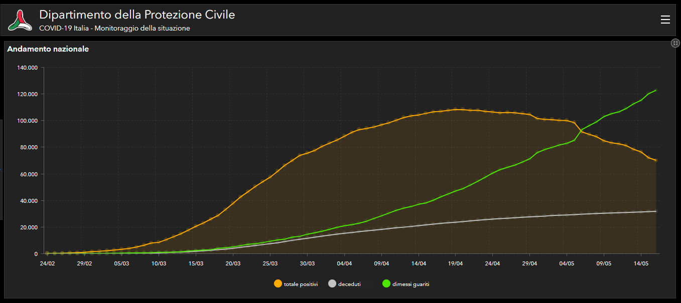 Rispetto a ieri i deceduti sono 153 e portano il totale a 31.763. Il numero complessivo dei dimessi e guariti sale invece a 122.810, con un incremento di 2.605 persone rispetto a ieri.
