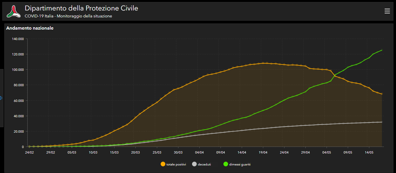 Rispetto a ieri i deceduti sono 145 e portano il totale a 31.908. Il numero complessivo dei dimessi e guariti sale invece a 125.176, con un incremento di 2.366 persone rispetto a ieri.