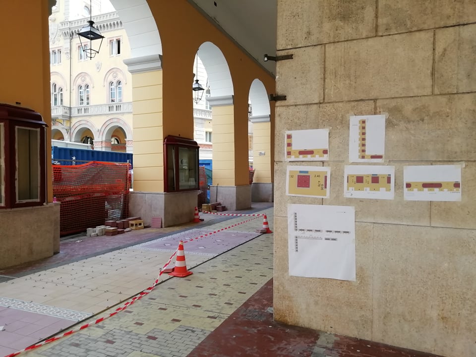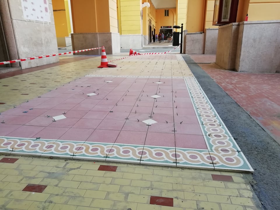 I lavori per la riqualificazione dei portici di Oneglia, dopo una sospensione dovuta alle difficoltà logistiche legate all’emergenza COVID-19, sono proseguiti. Dopo la tinteggiatura di archi e pilastri in via della Repubblica, gli operai hanno iniziato la posa del nuovo pavimento, caratterizzato da decorazioni e tinte color pastello.