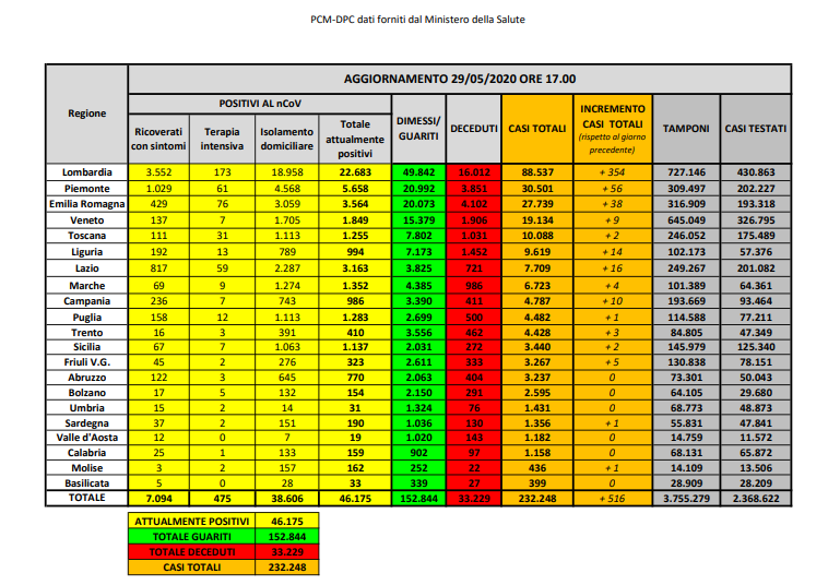 Nell’ambito del monitoraggio sanitario relativo alla diffusione del Coronavirus in Italia, a oggi, 29 maggio, il totale delle persone che hanno contratto il virus è di 232.248, con un incremento rispetto a ieri di 516 nuovi casi.