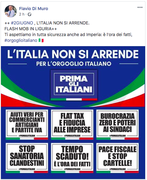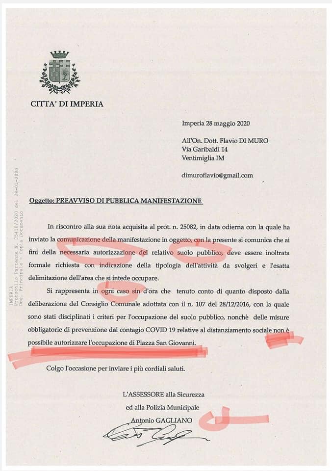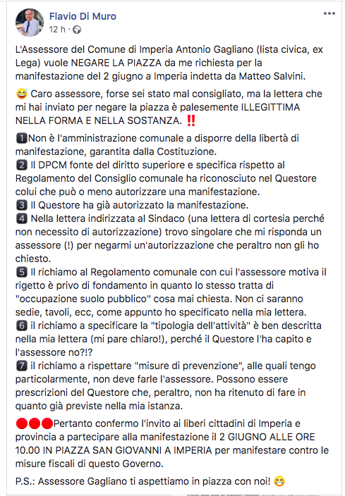 Dopo il diniego da parte di Gagliano di Piazza San Giovanni a fronte della deliberazione del consiglio comunale n.107 del 28.12.2016 e delle misure di contenimento del Coronavirus Di Muro ha “sfidato” l’assessore Gagliano confermando la sua presenza e quella degli esponenti del carroccio nel centro di Oneglia invitando pubblicamente la cittadinanza a partecipare definendo la lettera di Gagliano “illegittima nella forma e nella sostanza”.