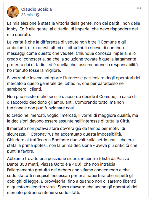“La mia elezione è stata la vittoria della gente, non dei partiti, non delle lobby. Ed è alla gente, ai cittadini di Imperia, che devo rispondere del mio operato”. Inizia così il post del sindaco di Imperia Claudio Scajola in risposta allo sciopero di questa mattina degli ambulanti del mercato di Oneglia contrari allo spostamento dei banchi in Piazza Maestri del Commercio (parcheggio ex Agnesi) e in banchina Aicardi.
