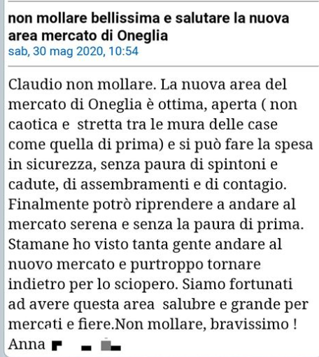 “La verità – prosegue il primo cittadino – è che la differenza di vedute non è tra il Comune e gli ambulanti, è tra questi ultimi e i cittadini. Io ricevo di continuo messaggi come questo che vedete. Chiunque conosca Imperia, e io credo di conoscerla, sa che la soluzione trovata è quella largamente preferita dai cittadini ed è quella che, assumendone la responsabilità, ho ritenuto fosse la migliore.