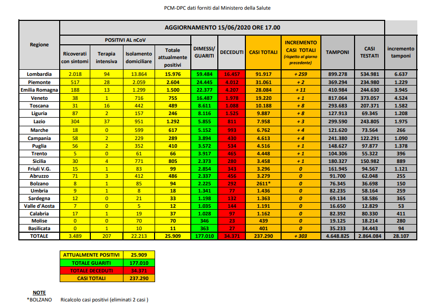 Nell’ambito del monitoraggio sanitario relativo alla diffusione del Coronavirus in Italia, a oggi, 15 giugno, il totale delle persone che hanno contratto il virus è di 237.290, con un incremento rispetto a ieri di 303 nuovi casi.