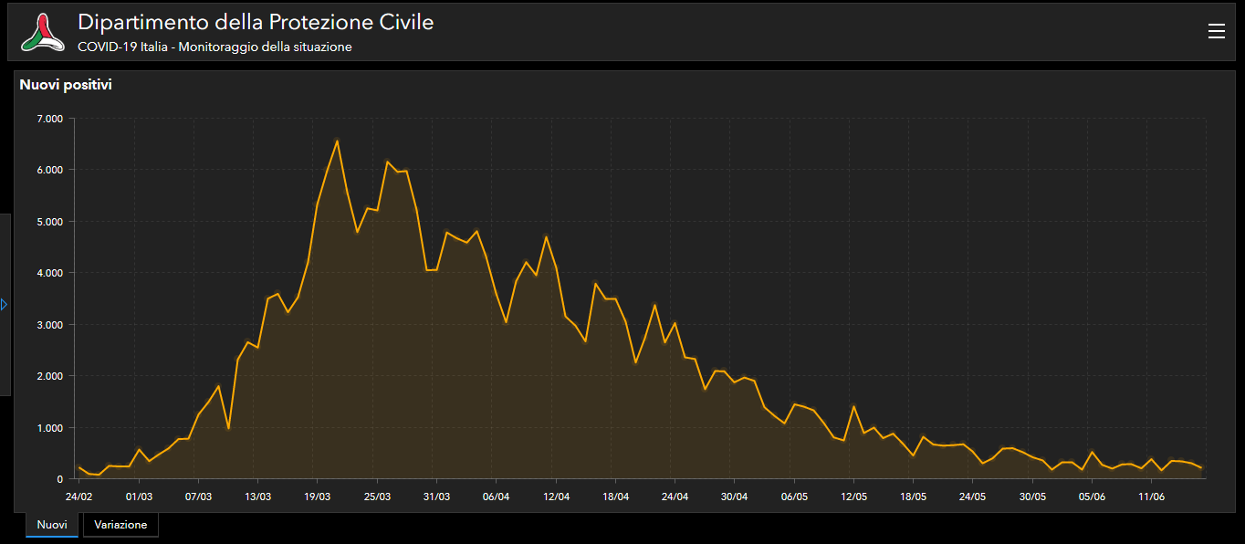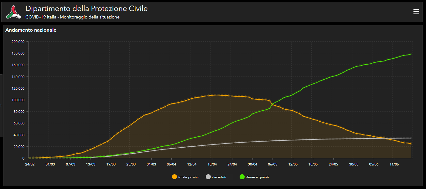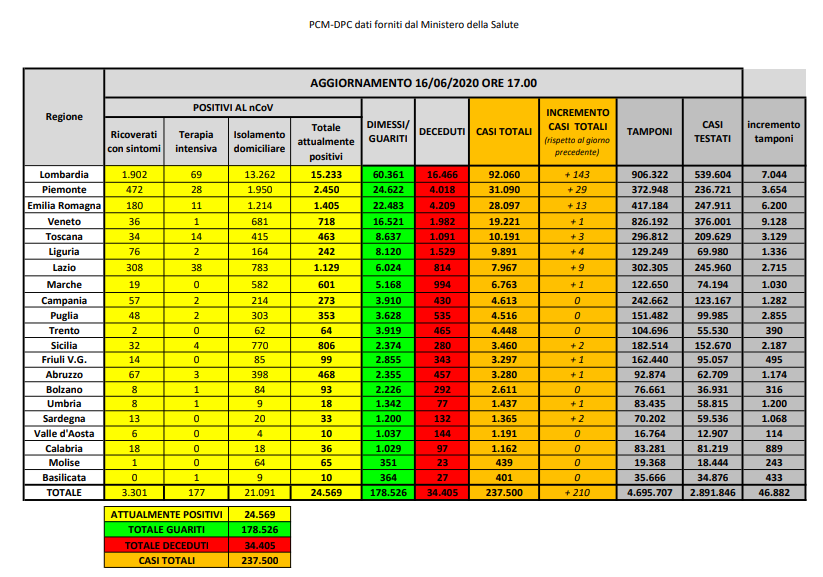 In particolare, nell’ambito del monitoraggio sanitario relativo alla diffusione del Coronavirus in Italia, a oggi, 16 giugno, il totale delle persone che hanno contratto il virus è di 237.500, con un incremento rispetto a ieri di 210 nuovi casi.