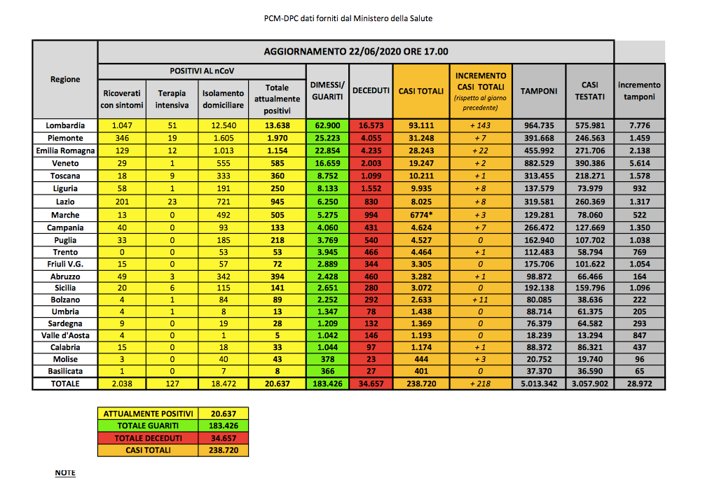 Nell’ambito del monitoraggio sanitario relativo alla diffusione del Coronavirus sul nostro territorio, a oggi, 22 giugno, il totale delle persone che hanno contratto il virus è di 238.720, con un incremento rispetto a ieri di 218 nuovi casi.