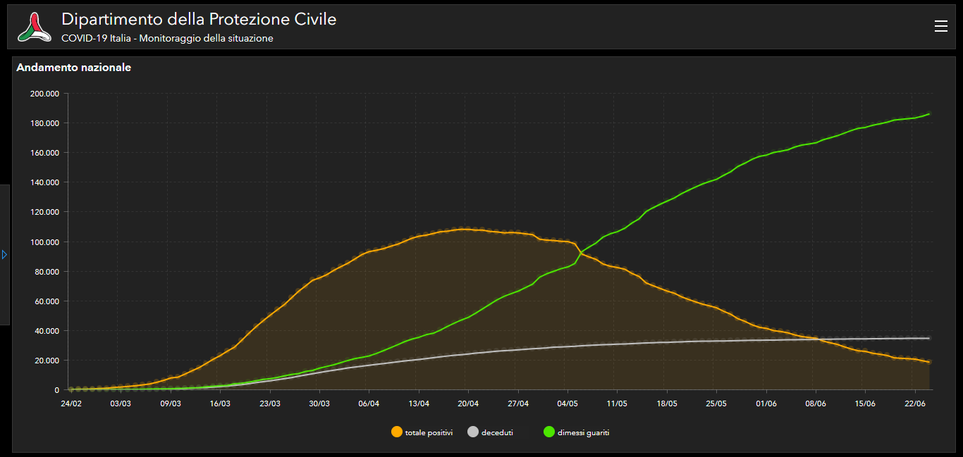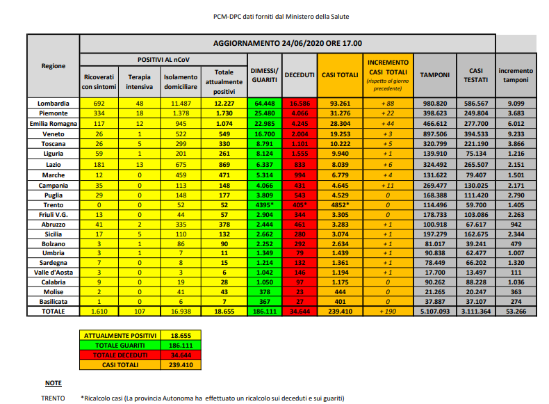 Nell’ambito del monitoraggio sanitario relativo alla diffusione del Coronavirus in Italia, a oggi, 24 giugno, il totale delle persone che hanno contratto il virus è di 239.410, con un incremento rispetto a ieri di 190 nuovi casi.