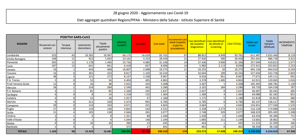 Tornano a crescere i pazienti in terapia intensiva, +1 rispetto a ieri, per un totale di 98. Sono invece 22 i decessi nelle ultime 24 ore, che portano il bilancio da inizio emergenza a 34.738.