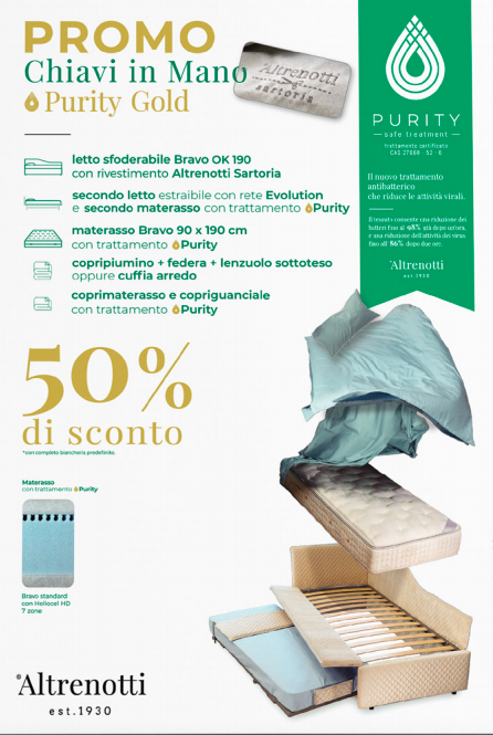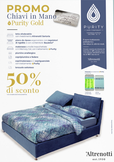 Basta con le notti insonni, “Artarreda Arredamenti” di San Bartolomeo al Mare ha riservato ai suoi clienti una promozione irripetibile sui letti con la nuova tecnologia “Purity”: Il nuovo trattamento antibatterico che riduce le attività virali.