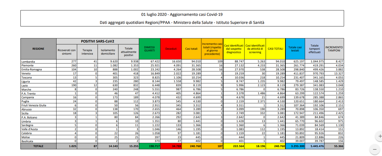 Coronavirus, Italia: il bollettino di mercoledì 1 luglio