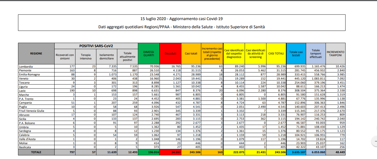 Coronavirus, Italia: il bollettino di mercoledì 15 luglio