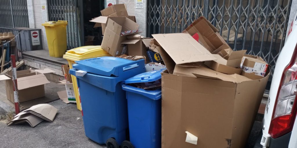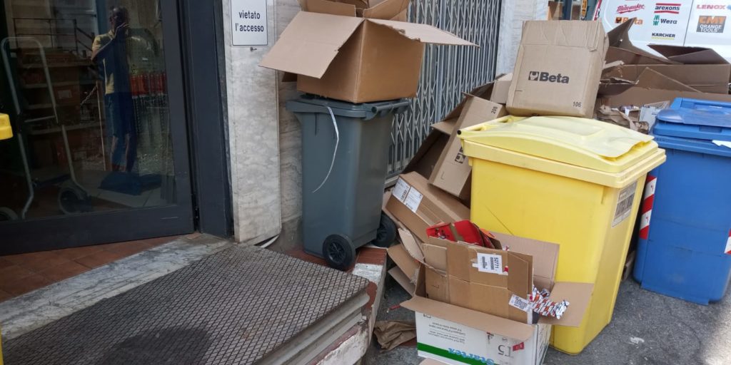 - “Siamo sommersi dai cartoni – scrivono commercianti di via Buonarroti – sono 10 giorni che telefoniamo tutti giorni pregando di venire a ritirare, anche in Comune, ma non viene nessuno. Non riusciamo più a lavorare, senza contare i rischi che questo accumulo comporta”.