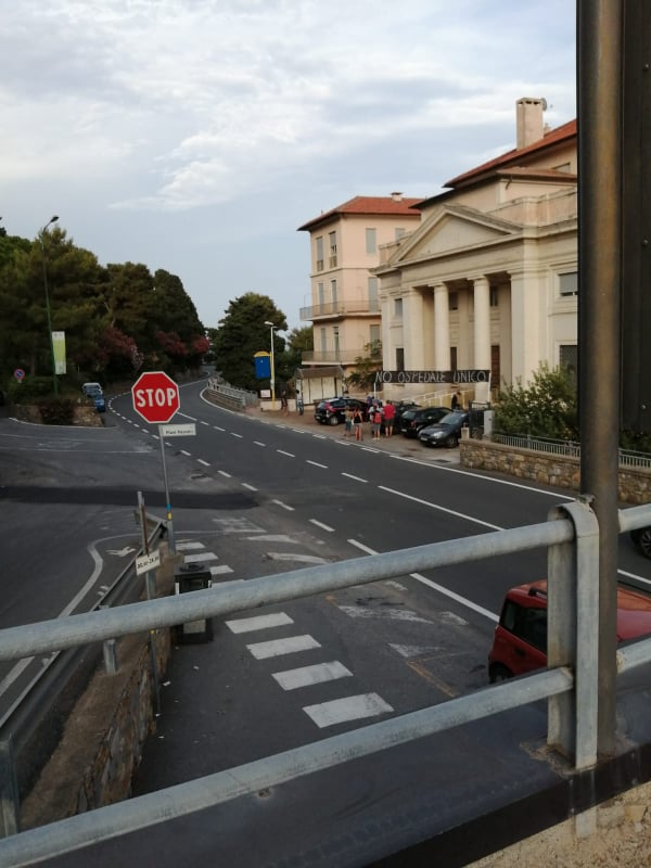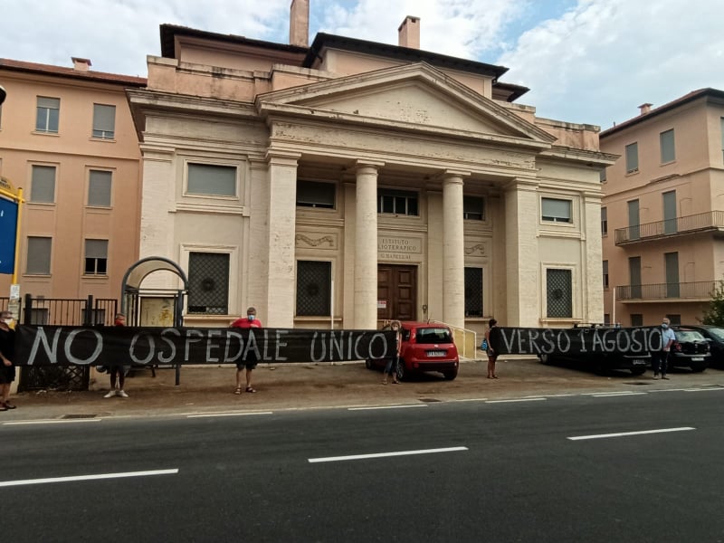 Gli attivisti del centro sociale “La Talpa e l’Orologio“, che hanno spiegato di aver manifestato davanti all’ex sanatori (di proprietà della Regione Liguria, chiuso da anni e in vendita) o in quanto simbolo dell’inefficienza delle politiche sanitarie regionali, hanno esposto alcuni striscioni e invitato la cittadinanza a partecipare alla manifestazione contro l’Ospedale Unico programmata per il prossimo 1 agosto a Imperia.