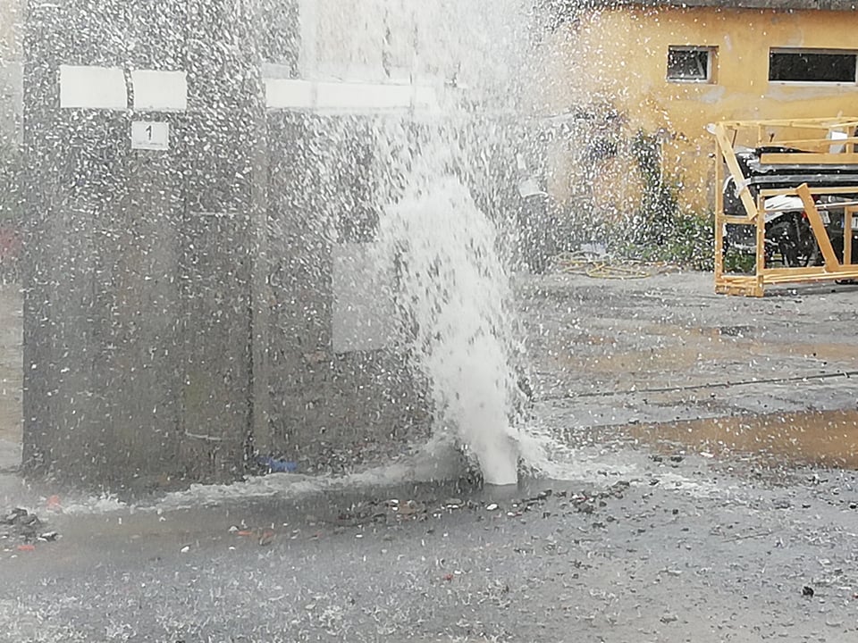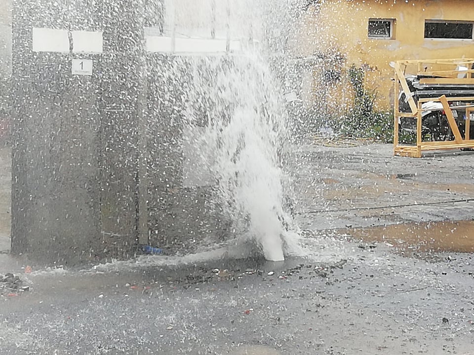 Il getto d’acqua, ancora attivo in questi istanti, sta allagando la strada e, avendo spaccato l’asfalto, sta spargendo detriti in tutta la zona.