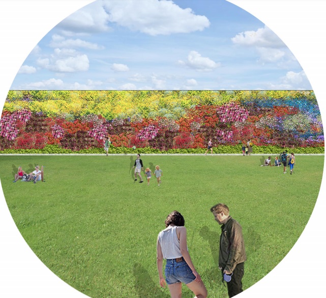Invece di “nascondere” il depuratore, il progetto prevede di esaltarne la struttura attraverso la realizzazione di una parete verde fiorita di fronte alla quale riposare lo sguardo. Le essenze sono state scelte per ricreare l’effetto di un tramonto ispirato agli acquarelli realizzati in Italia da William Turner a inizio Ottocento.