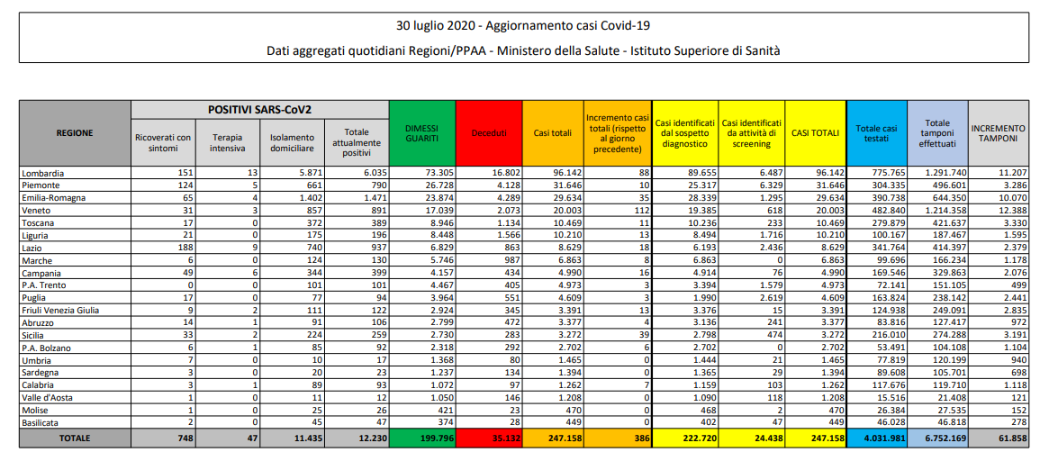 Coronavirus, Italia: il bollettino di giovedì 30 luglio