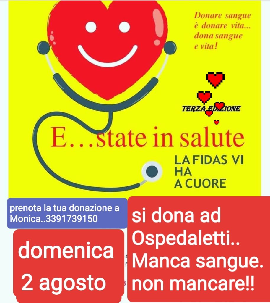 Domenica 2 Agosto si dona a OSPEDALETTI su autoemoteca, e nel Centro Raccolta Sangue FIDAS di Imperia in via Don Abbo 12 5° piano.