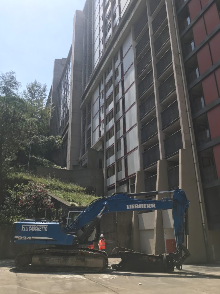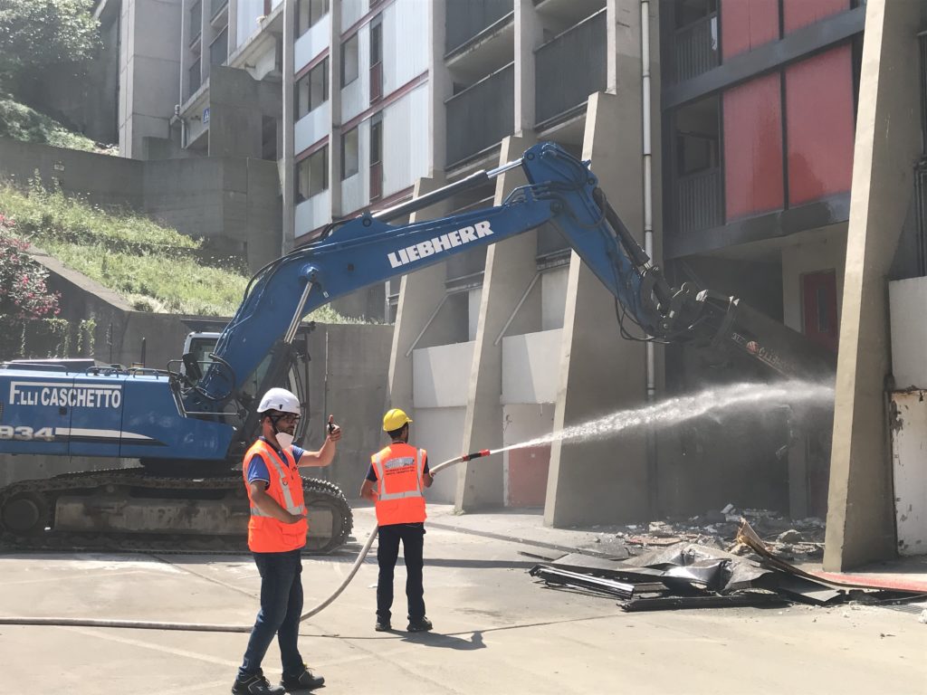 Contemporaneamente è in corso la fase del cosiddetto strip-out interno che consiste nella rimozione dall’interno degli alloggi delle Dighe Rossa e Bianca di mobili e suppellettili residui e della rimozione di infissi, tapparelle, corpi scaldanti, tubazioni, impianti elettrici, rivestimenti. Una volta conclusa questa fase, si avvierà la fase della rimozione dei pannelli esterni e poi, in autunno, si passerà alla demolizione delle strutture.