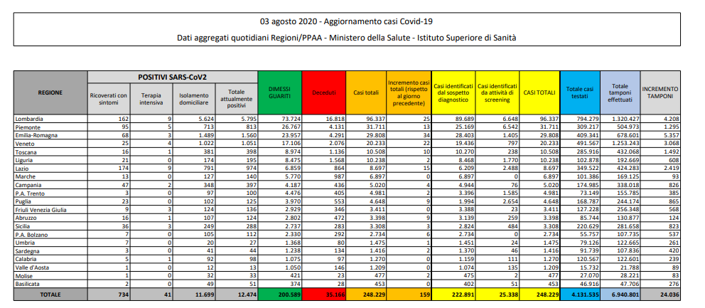 Coronavirus, Italia: il bollettino di lunedì 3 agosto