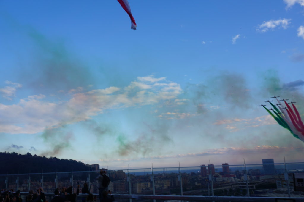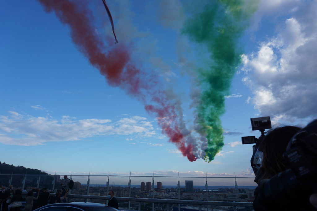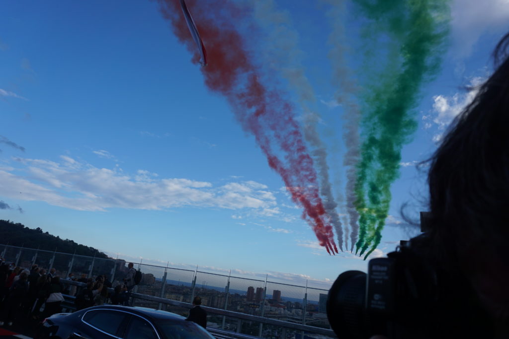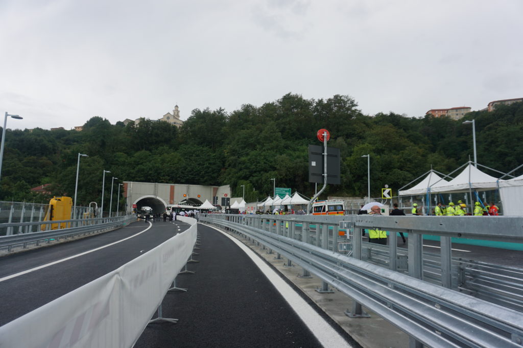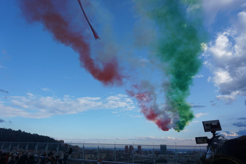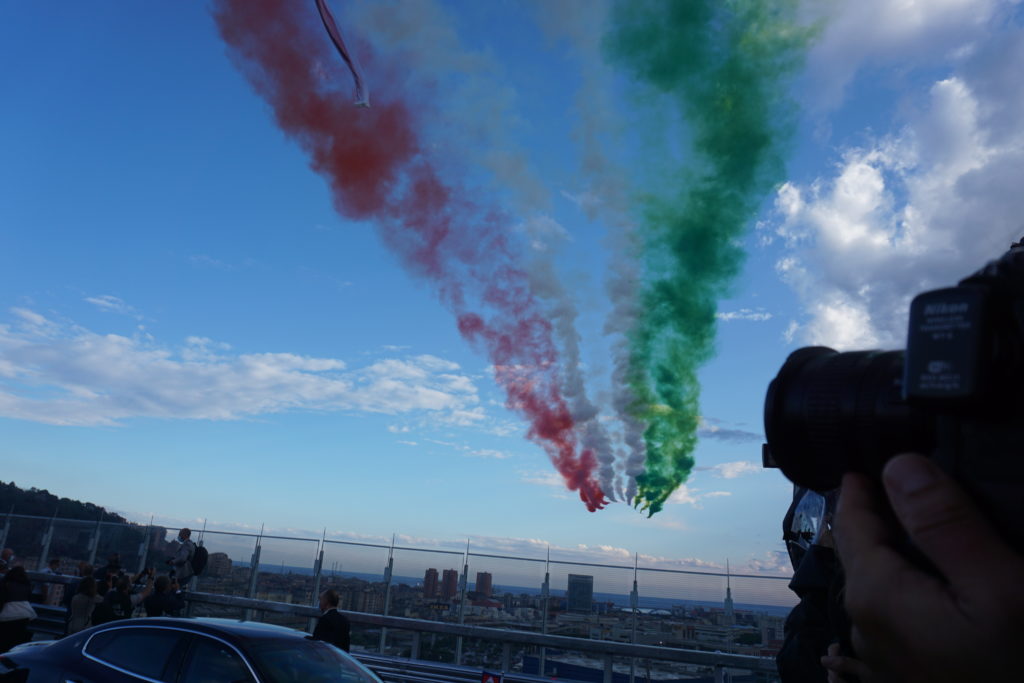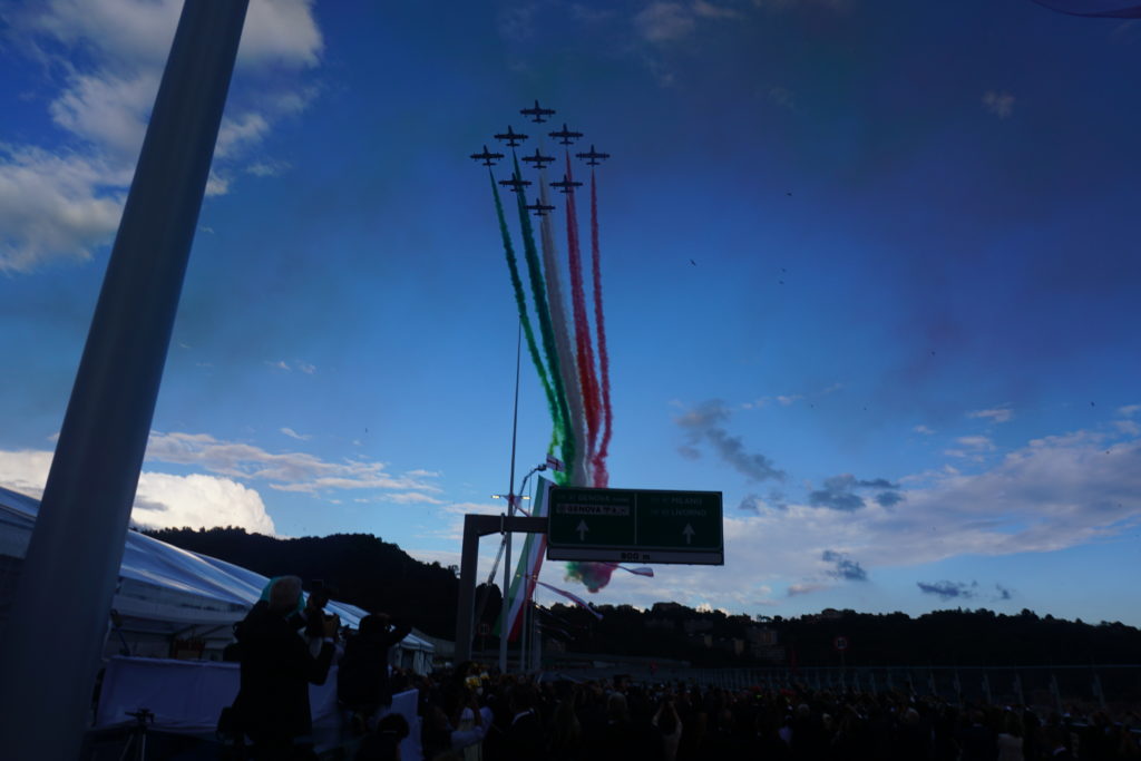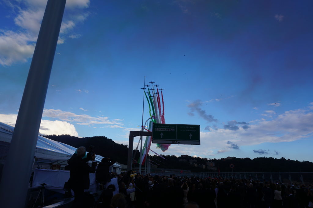 “Creuza de ma” di De Andrè (rivisitata da 18 artisti italiani), l’Inno d’Italia, la toccante lettura dei nomi delle 43 vittime del crollo del Morandi, il silenzio. E poi il taglio del nastro, il suono delle sirene delle navi e il suggestivo passaggio delle Frecce Tricolori.
