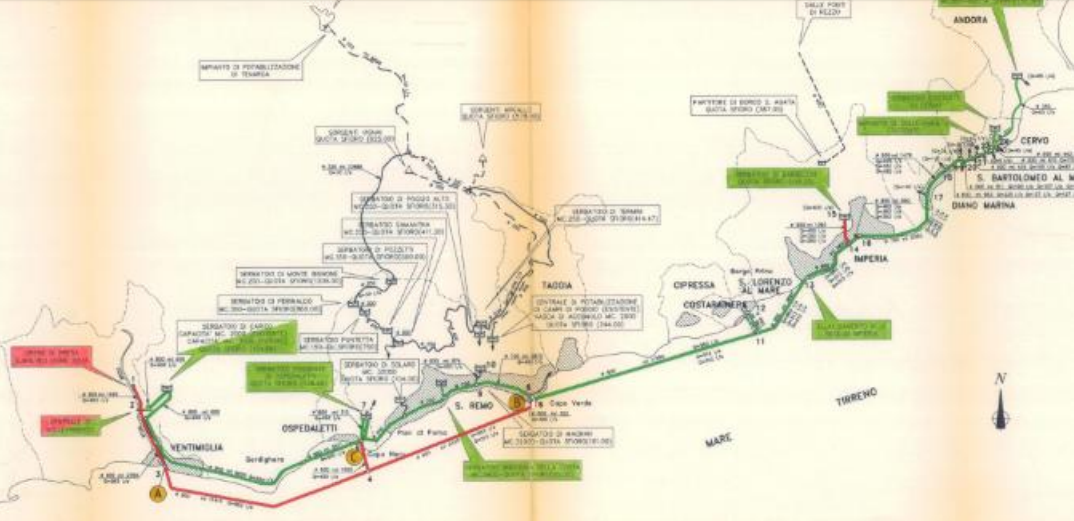 Altrettanto noto è che da oltre un anno la condotta Roja 1 è interrotta presso il Comune di Sanremo con la conseguenza che presso il punto di approdo della condotta Roja 2 presso Capo Verde una parte dell’acqua da essa trasportata venga prelevata e inviata, in senso contrario al normale funzionamento del sistema, verso Sanremo tramite il ramo di levante della condotta Roja 1 insistente nel Comune di Sanremo stesso.