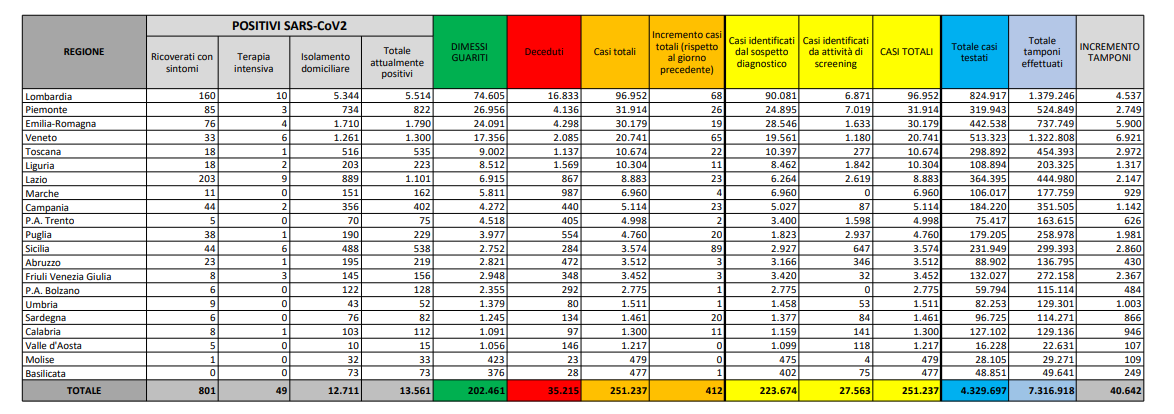 Sono 421 (in aumento rispetto a ieri, 259 ) i nuovi casi di Coronavirus in Italia nelle ultime 24 ore, 89 dei quali in Sicilia (Di questi, 71 sono migranti come comunica il ministero della Salute citando la segnalazione della Regione Sicilia.) che, al momento, risulta tra le regioni maggiormente interessate dall’emergenza Covid-19. A seguire Lombardia (+68), Veneto (+65) e Piemonte (26). In Liguria i nuovi contagi sono 11 (ieri erano 10).