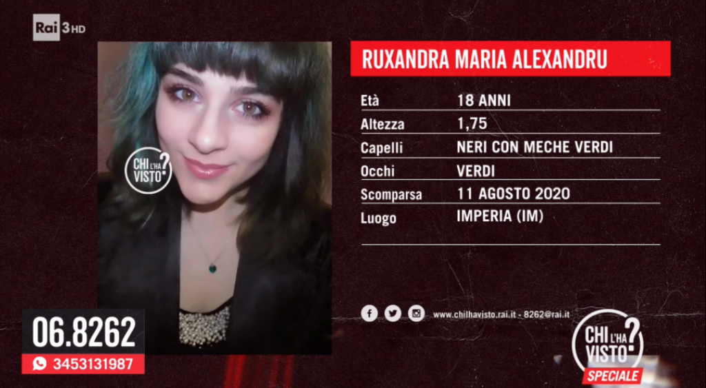 “Ha conosciuto un ragazzo ed è cambiata. Vi prego aiutatemi”. È questo il disperato appello di Magdalena Stan, la mamma di Ruxandra Alexandru 18enne italiana, di origine rumena, scomparsa da Imperia l’11 agosto 2020.