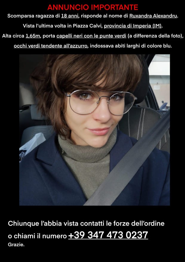 Ruxandra, lo ricordiamo, è stata vista l’ultima volta in piazza Ulisse Calvi, a Imperia Oneglia. Indossava vestiti blu, larghi. Frequenta il Liceo Artistico e vive a Imperia con la madre, che ha presentato denuncia di scomparsa ai Carabinieri. Chiunque dovesse vederla, contatti immediatamente le forze dell’ordine.