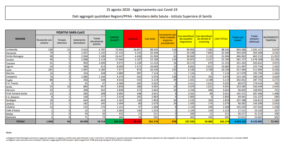 Coronavirus, Italia: il bollettino di martedì 25 agosto