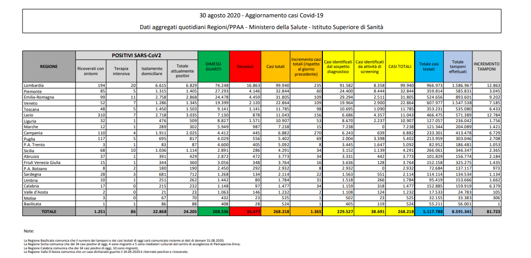 Coronavirus, Italia: il bollettino di domenica 30 agosto
